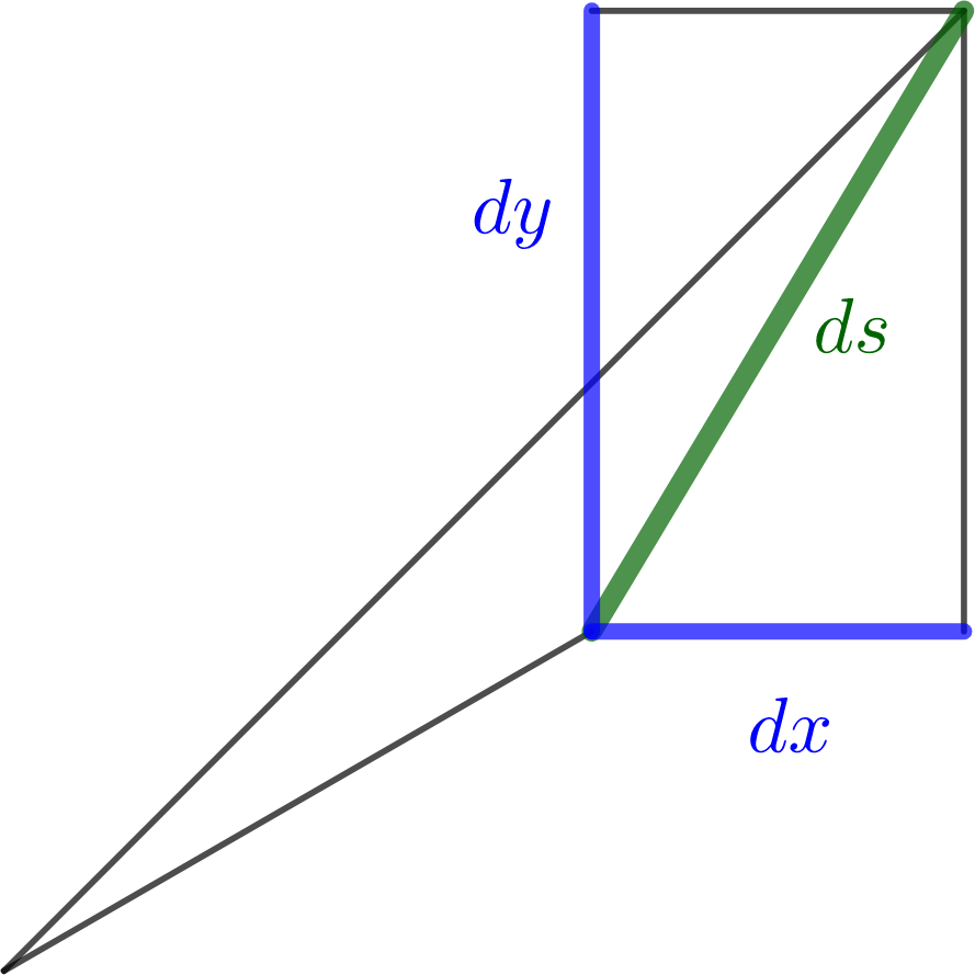 Figure2.2.2.The first figure shows the rectangular components of the vector differential \(d\rr\) in two dimensions, while the second figure shows the infinitesimal version of the Pythagorean Theorem.