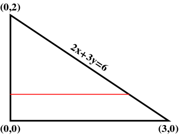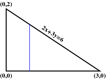 where \(T\) denotes the triangle. We first add these up vertically, along the line shown in Figure 3.7.2. That is, we integrate first with respect to \(y\text{.}\) What are the limits? We already know the answer: the line starts at \(y=0\text{,}\) and goes to \(y=2-2x/3\text{!}\) So those are the limits for the integration with respect to \(y\text{.}\) We then add up the “columns” in the \(x\)-direction; \(x\) clearly goes from \(0\) to \(3\text{.}\) Thus,
