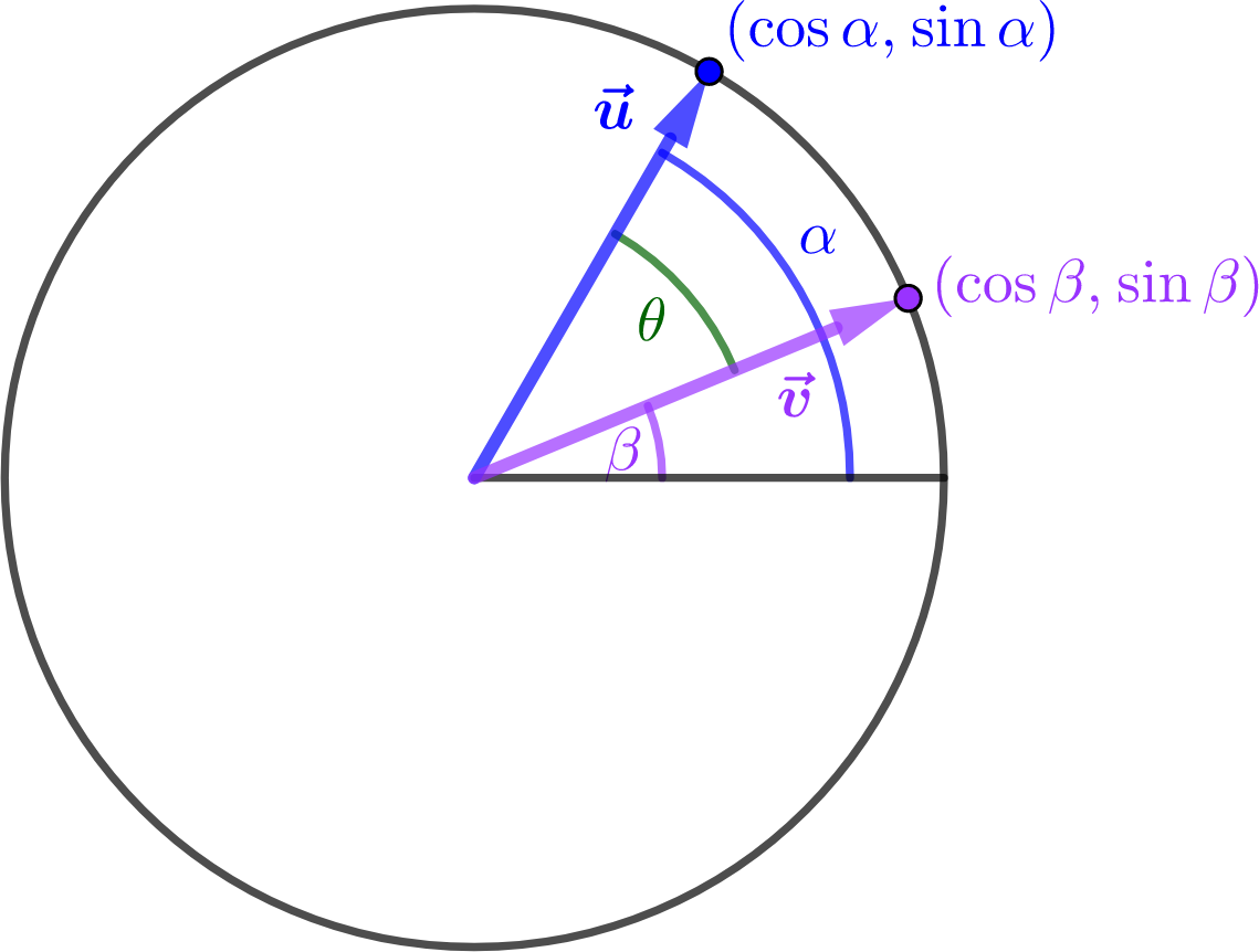 On the other hand, since the angle \(\theta\) between \(\uu\) and \(\vv\) is clearly \(\beta-\alpha\text{,}\) and since \(\uu\) and \(\vv\) are unit vectors, the geometric formula for the dot product yields